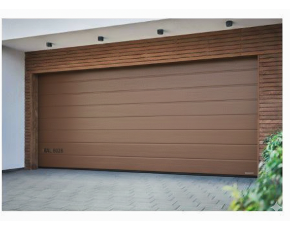Porte de garage sectionnelle motorisé Renomatic H.2000 x l.2375mm Coloris Brun 8028 Woodgrain