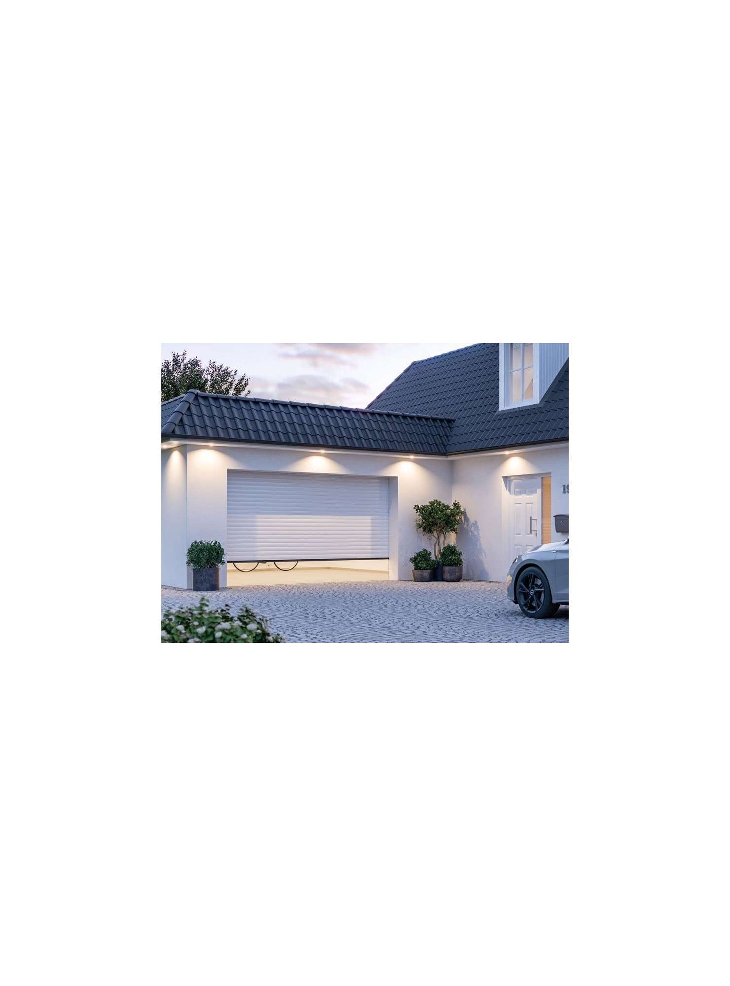 Cadres / Cadres dormants : Rails de guidage latéraux en profilés d’aluminium extrudés avec profilé à glissière intégré et joint à brosses. Rails de guidage, habillage de linteau, revêtement de tablier et de joue latérale en tôle d’acier, avec revêtement haut de gamme de la couleur du tablier de porte.
